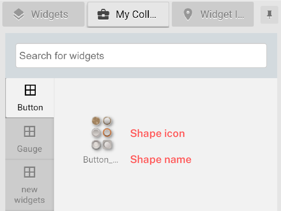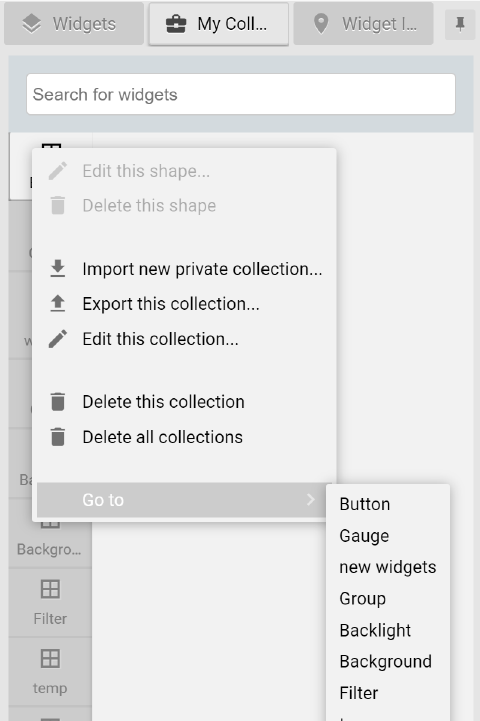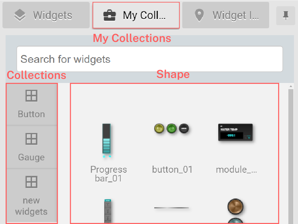 Users can put designed widget or widget group into My Collections for future usage. The idea is for design-reuse. Some of the elements in HMI design are quite common across the board. For example, a password input page can be found in various HMI applications. Users can design a password input page and place this page in My Collections to be used in afterward projects.
