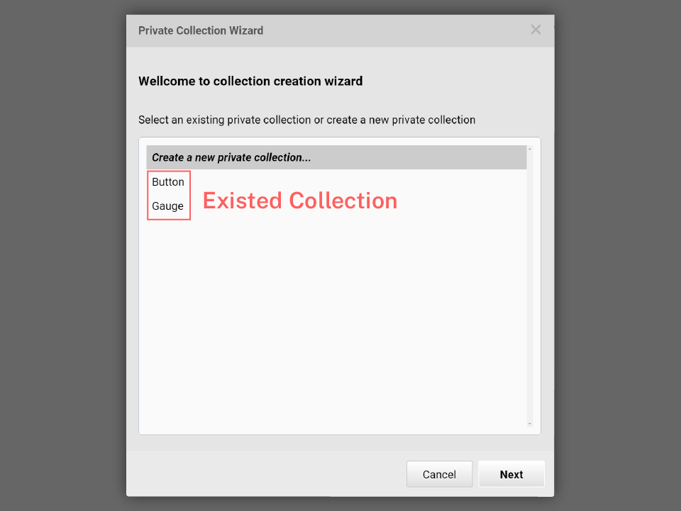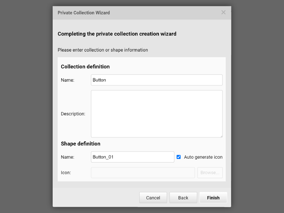 Enter the collection’s name, description and then choose an icon for displaying this collection. After clicking Finish, this private collection is created. The collection’s name is shown as a tab whereas the name for shape definition is shown as the icon name.