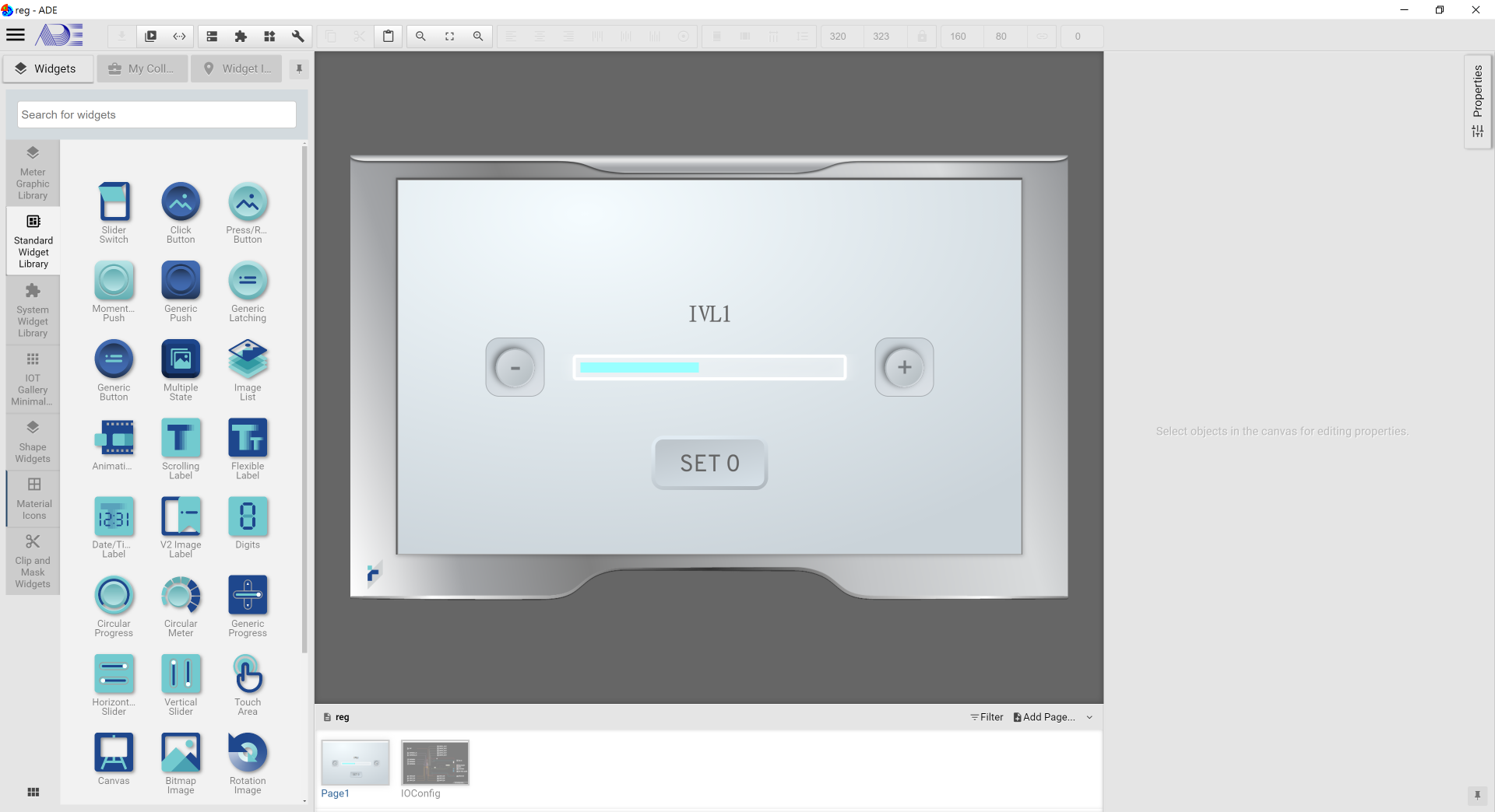 To complete this HMI project, a Progress Bar and a Scrolling Label are then dragged and dropped into the design panel. These two widgets are also bound with register num. The maximum and minimum values of the progress bar is set to the desired values. The Scrolling Label is to show the value of register num.