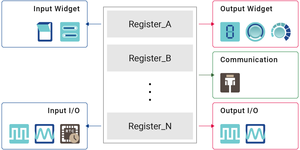 When users want to store a value from an Input Widget, users can accomplish this simply by binding a register to this widget. On the other hand, when users want to display a stored value, they can bind a register to an Output Widget for such purpose.