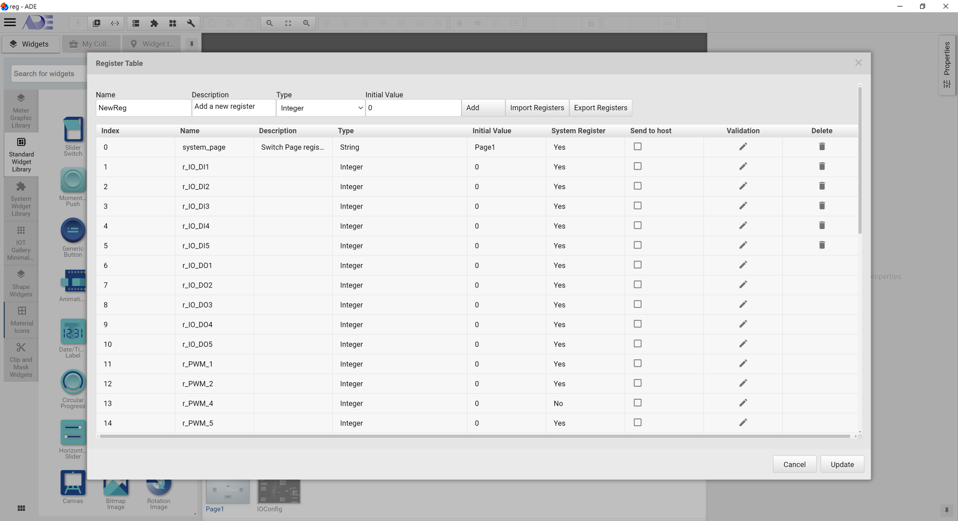 Any input value for HMI can be stored, modified by widget setting, or manipulated by a Blockly function. Thus, a place holder is required to store the input value. This place holder is called Registers. You can image registers as global variables in any high level programming language or X, Y, D, M registers in PLCs. Every register in HMI has a unique name and ID for identification. Registers has the data type attribute for ensuring the right data format is adopted.