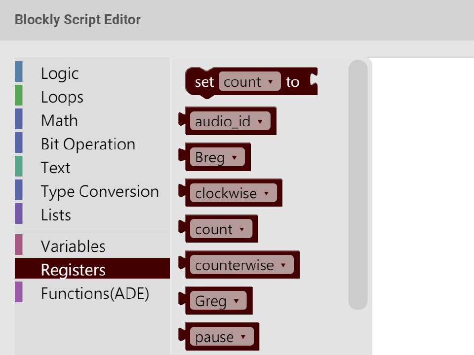 Registers can be manipulated by the built-in Blockly viusal programming langague: