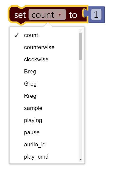 Set Register: Set Register Block is to set the value of a register. First, users can select which register to be set. Following this block, a value block can be attached. The assigned value’s type must meet the type definition of the register. If this register is bound with an output widget, the change of the register’s value will be reflected next time when the screen refreshes.