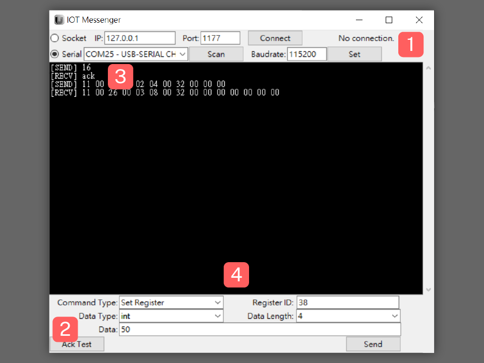 In order to ensure that the connection is established properly, users can click Ack Test. Once clicked, the system will send out 16. If ack is received, the connection is in order; otherwise, the connection is not established yet.