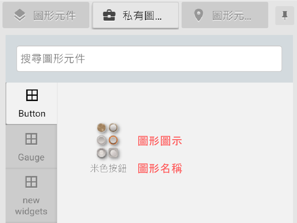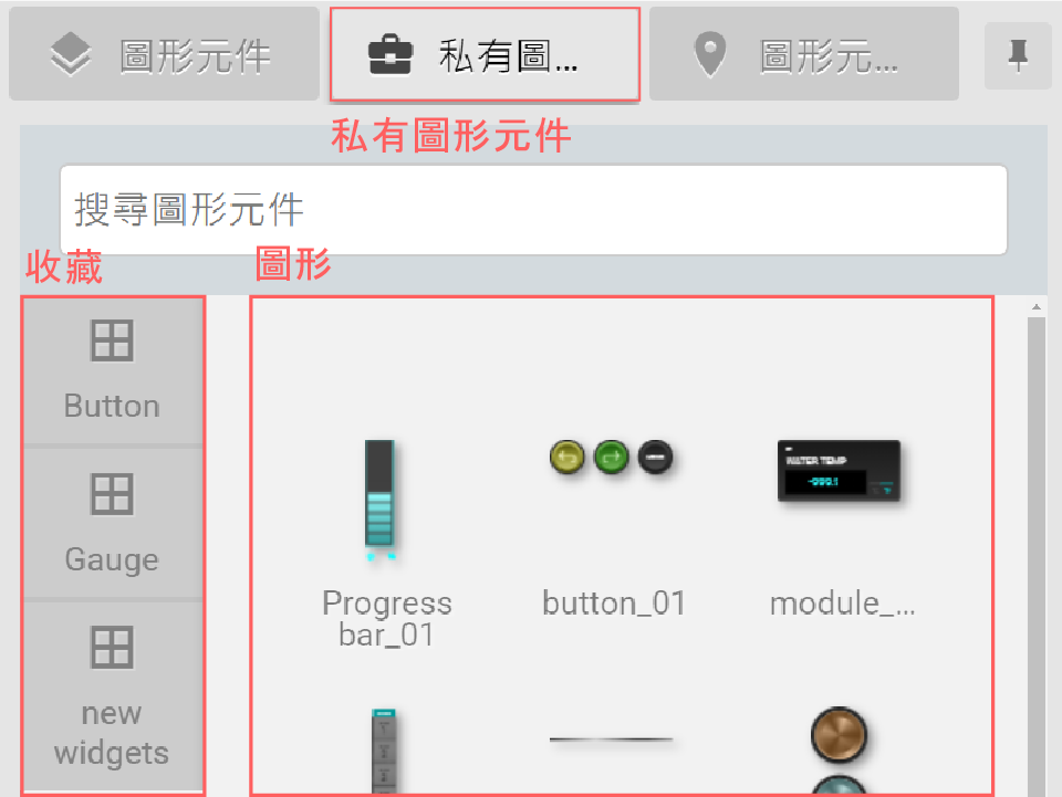 使用者可將設定完成的元件、設計完成的群組存入私有圖形元件庫以供日後在不同設計文件中使用,以達到設計複用之目的。舉例來說,密碼輸入頁面為HMI常用設計,使用者設定密碼輸入相關元件之屬性,群組後加入私有圖形元件,即可重複使用,節省設計花費時間。