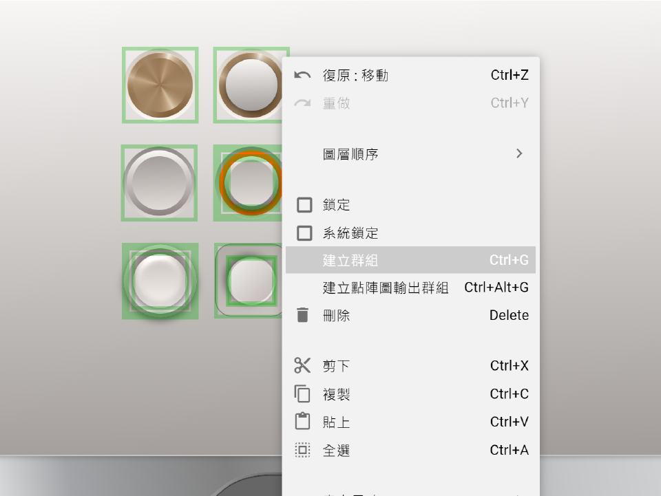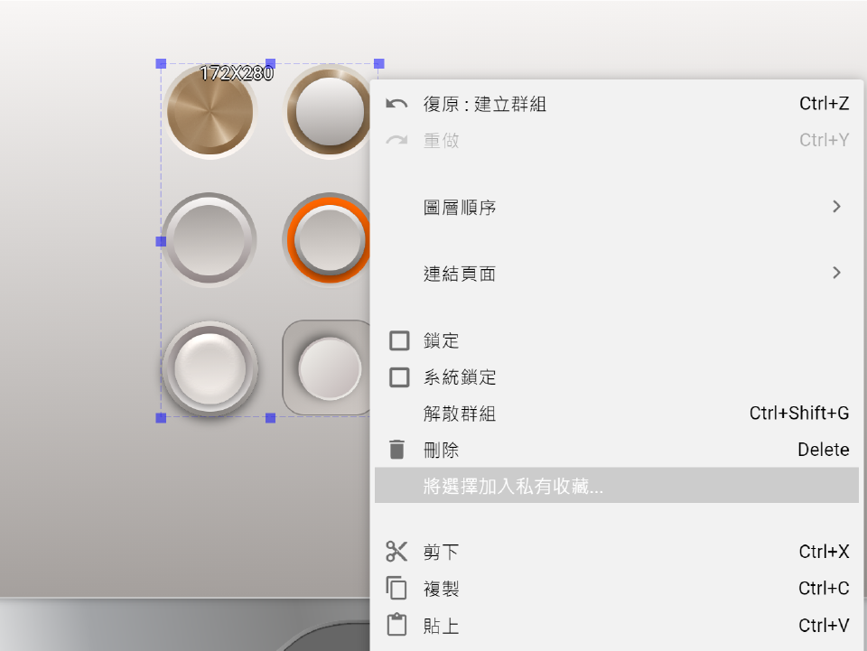 將要加入私有圖形元件的元件全選取起來,點擊右鍵選擇建立群組,如果只有單一元件要加入私有圖形元件則不須建立群組