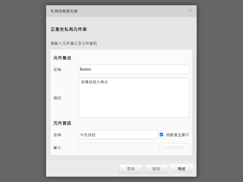 輸入元件集合名稱、描述和元件名稱並選擇元件圖示,設定完點擊完成即可在私有圖形元件獲得新建立的私有元件庫